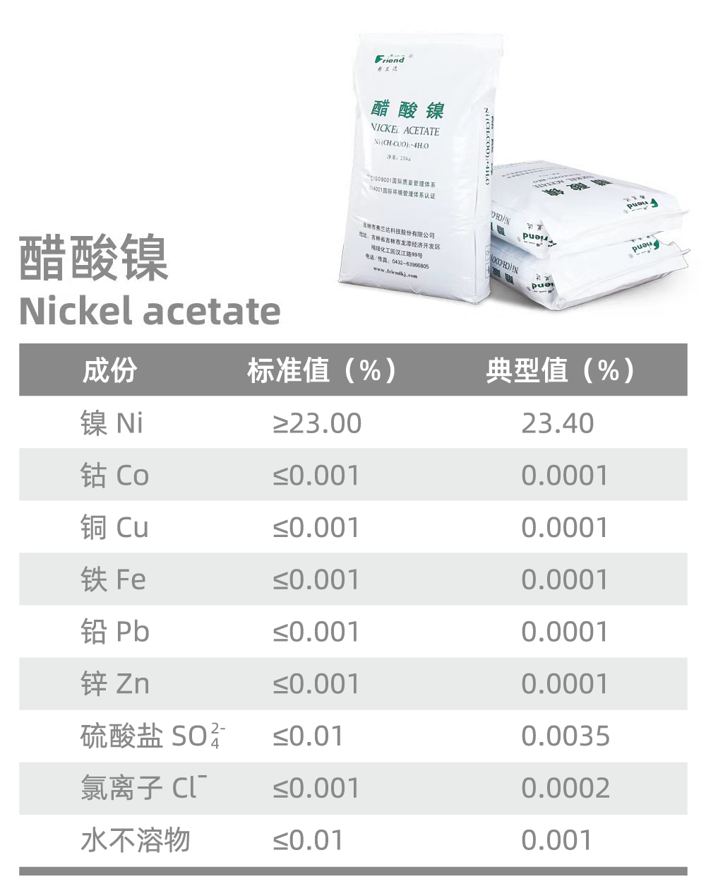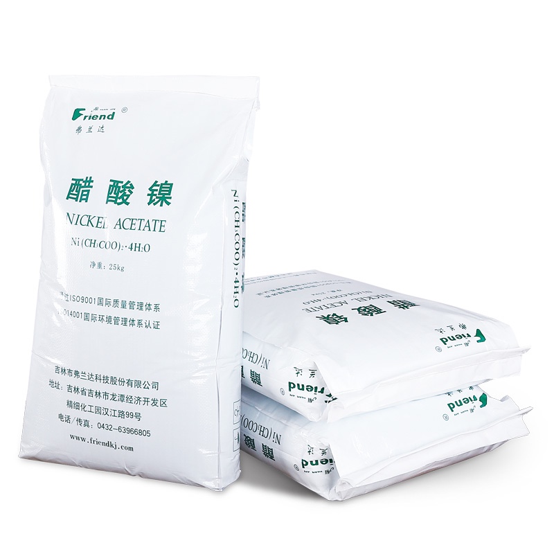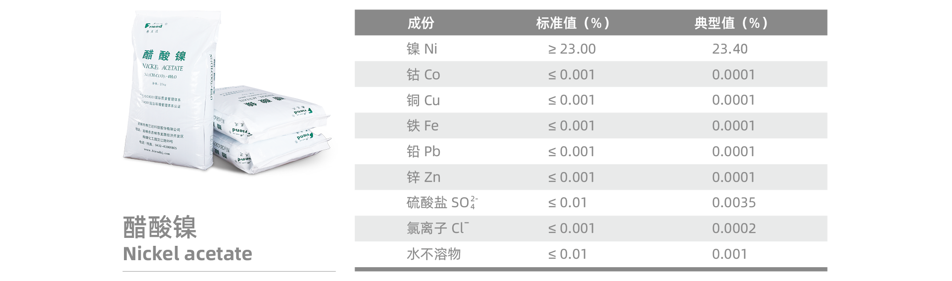 醋酸鎳(Nickel acetate) 分子式:C4H6O4Ni·4H2O 分子量:248.86 性 狀:綠色結(jié)晶性粉末,有醋酸氣味,遇水可溶解。 用 途:主要用于封孔劑、表面處理劑、電鍍、陽極氧化、金屬著色、催化劑和陶瓷色釉以及分析化學(xué)試劑等。 包 裝:塑編袋裝,每袋25公斤。 儲 運:運輸過程中,防止雨淋、受熱、受潮。不宜與酸類物品混運。貯存在通風、陰涼、干燥的庫房內(nèi),防止雨淋、受潮。不宜與酸類物品混貯。